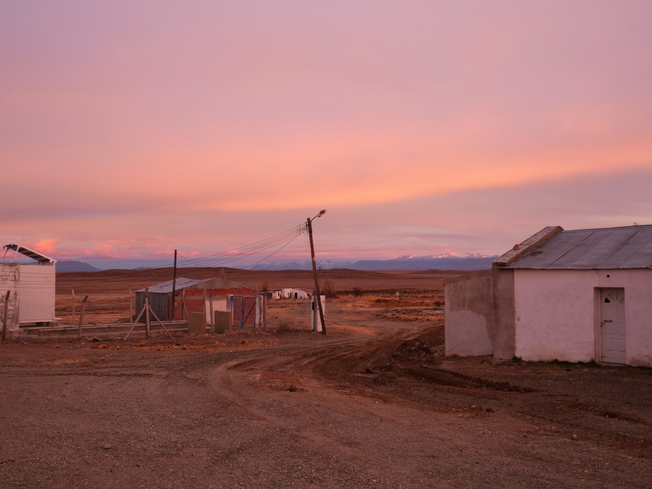 Nach einem weiteren Tag Autofahrt auf der Ruta 40 durch die patagonische Steppe suchen wir in Baja Caracoles ein Zimmer, einem kargen, fast verlassen aussehenden Ort mit einer Tankstelle, zwei drei anderen Häusern und einem „Hotel“. Im Hotel befindet sich zugleich eine Art Tante Emma Laden, wo man von Kleidern über Pferdeköpfe zum aufhängen, Nahrungsmitteln, Salben, Getränke, (fast) alles bekommt. Der Laden ist zugleich ein Bar/Restaurantbetrieb. Auf alle Fälle erhalten wir als einzige Gäste ein kleines Zimmer mit unverbauter Aussicht über eine riesige Steppenlandschaft und Guanacoherden. Das Fenster können wir nicht öffnen, es ist zugenagelt, damit der Wind etwas weniger durch die Ritzen pfeift.