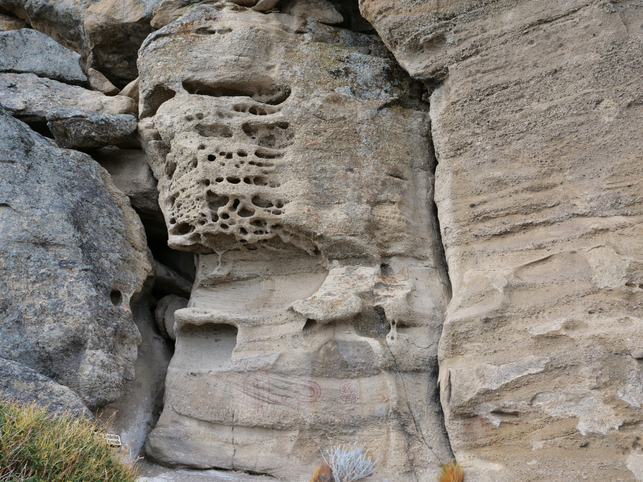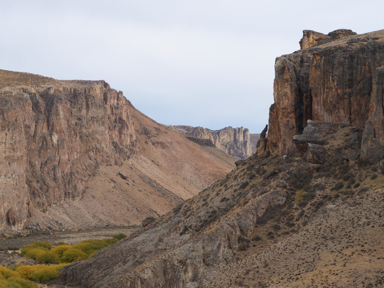 Cueva de las Manos ist unser nächstes Ziel. Wie eine Oase zieht sich ein sattgrünes Flusstal, Canòn del Rio Pinturas durch die Landschaft und führt uns zu der weltberühmten Höhle (Unesco Weltkulturerbe). Erstaunlich gut erhaltene Zeichnungen aus drei verschiedenen Zeitepochen, von ungefähr 13000 bis etwa 1300 v.Chr. können wir bestaunen. Über die Bedeutung der Malereien wird spekuliert, weniges ist klar, jedoch auch so sehr eindrücklich. Mit einem Stempel im Pass verlassen wir die Höhle.