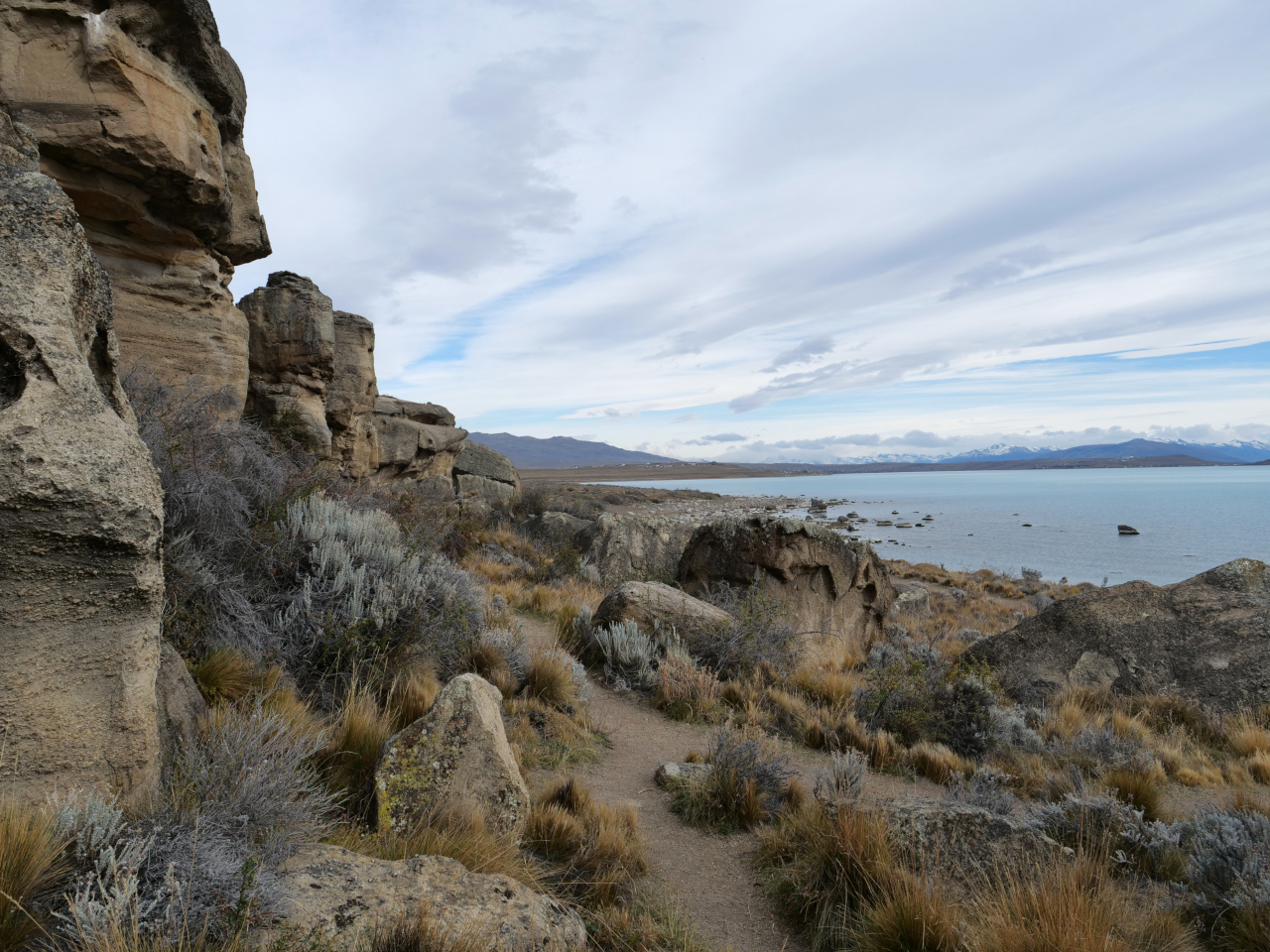 Entlang den Ufern des Lago Argentino spazieren wir erst zur Laguna Nìmez mit rosa Flamingos und anderen Zug- und Wasservögel bis zur Punta Walichu. Dort befinden sich eine Reihe Grotten mit über 4000 Jahre alten Höhlenmalereien die uns etwas über die Geschichte der Ureinwohner erahnen lassen.