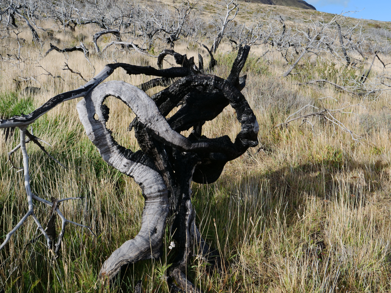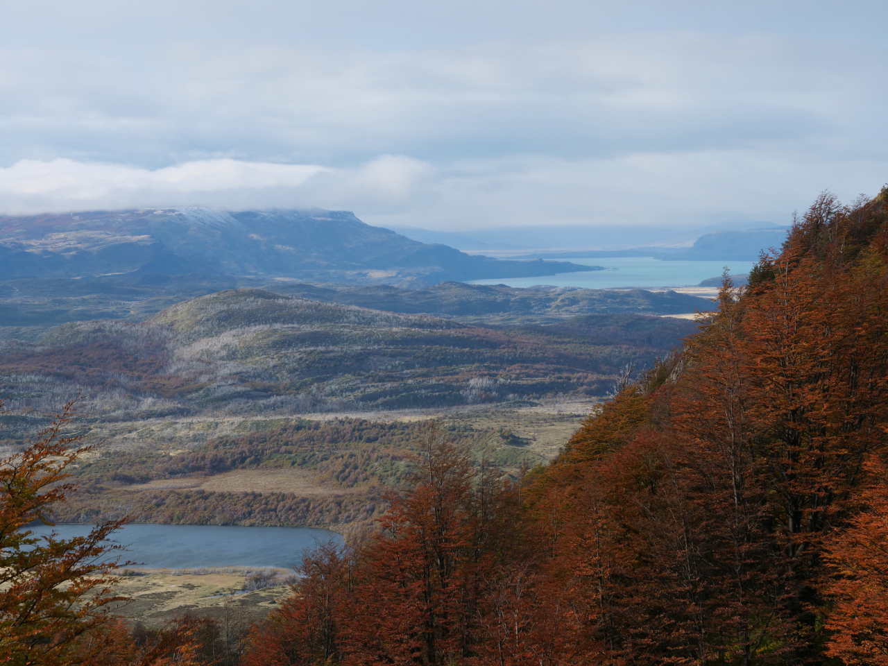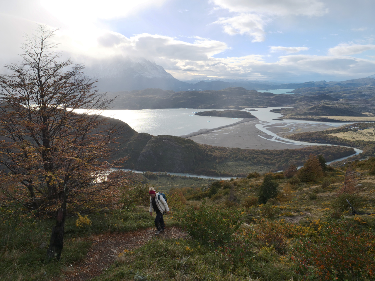 Auf dem Weg besuchen wir die Cueva del Milodòn, wo 1896 der deutsche Kapitän Eberhard die Überreste eines sehr gut erhaltenes Riesenfaultier gefunden hat. Leider sind sie mehrer tausend Jahre ausgestorben. Vielfältig sind die Wandermöglichkeiten im Nationalpark. Wir „besteigen“ den Mirador Condòr ohne dort Kondore, dafür jedoch einen so ungestümen Wind anzutreffen, dass wir unsere Bodenhaftung fast verlieren. Die Nacht verbringen wir im Nationalpark in einem der wenigen Hotels, Hotel Lago Grey, die offen sind und bezahlen in der Nebensaison für ein Standarddoppelzimmer 180 US$ die Nacht. Zu sagen ist jedoch, dass das Hotel sich sehr gut in die Landschaft integriert und von aussen überhaupt nicht auffällt.