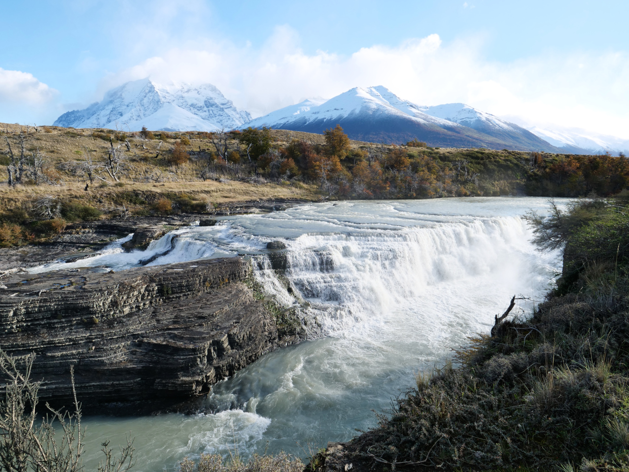 So holpern wir nach bestandener Überprüfung Kilometer lang über unebene, löchrige Naturstrassen, das reinste, etwas masochistische, Massageprogramm, sowohl für uns wie für das Auto. Die riesige, einsame flache Steppe die uns erwartet ist eindrücklich. Wir begegnen kaum einem Auto, wenn dann eher Lastwagen, vereinzelte durchtrainierte wettergegerbte FahrradfahrerInnen, unzähligen Guanacos, Nandus, Füchsen, Hasen, 1 ½ Gürteltieren (½ weil wir uns nicht sicher sind was es ist), Kondoren, Karakaras (Geierfalken). Kurz vor Puerto Natales passieren wir zum zweiten Mal die Grenze um in die Provinz Magallanes und dort nach Puerto Natales und Torres del Paine zu gelangen. Die Landschaft ist sehr abwechslungsreich, Südbuchenwälder verweben sich mit Graslandschaften, Fjorden, vielfarbigen Seen, Hochgebirge und Gletschern. Ob der Torres de Paine zu den Anden gehört scheint etwas umstritten zu sein. Das ändert jedoch nichts an seiner unbestritten einzigartigen Schönheit und Vielfalt.