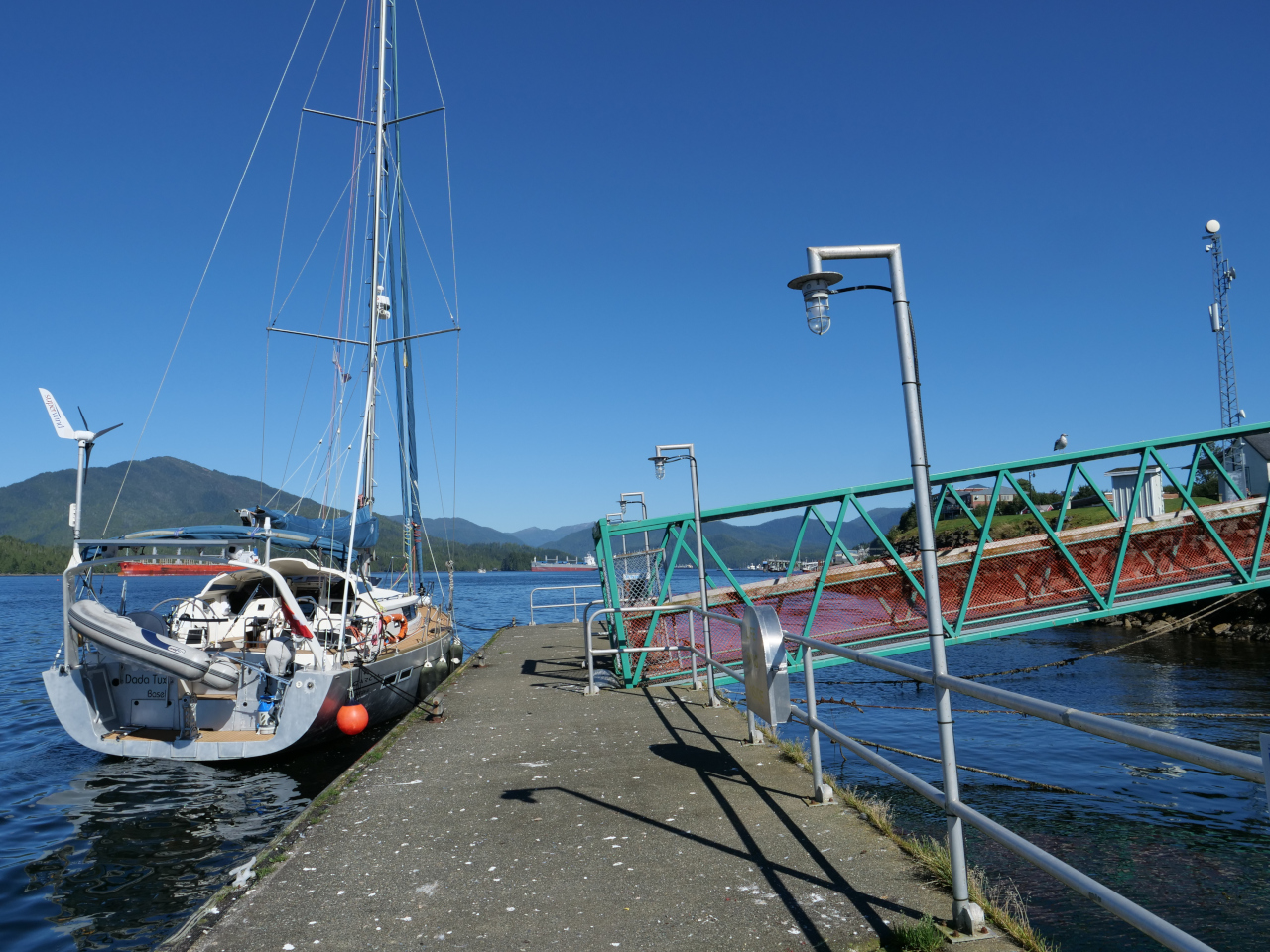 Kanada`s Grenzen sind zu. Es gibt jedoch die Möglichkeit eine Bewilligung zur Durchfahrt zu bekommen. Diese Information erhalten wir telefonisch von der CBP und der USCIS in Alaksa ebenso wie von den kanadischen Behörden. Diese Möglichkeit streben wir an und legen am, gegen das Land abgesperrten, Ligtheringsteg in Prince Rupert an. Zuerst telefonieren wir mit den nationalen kanadischen Zollbehörden welche wiederum mit den lokalen Behörden Kontakt aufnehmen und jemanden zur Dada Tux senden. Nach dem wir einen Fragekatalog zuerst am Telefon dann nochmals bei den zwei auf den Steg kommenden BeamtInnen beantworten erhalten wir eine Transitnummer. (Nicht alle Boote haben so viel Glück. Wir kennen mittlerweile einige, deutsche und US amerikanische Boote, welchen die Durchreise verboten wurde.) Wir reisen also nicht wirklich ein, erhalten keinen Passstempel nur Richtlinien die wir zu befolgen haben. D.h. keine Ausflüge an Land, bei Notfällen (Gesundheit, Nahrungsmittel, Dieselmangel, Schiffshavarie) muss man telefonieren und darf anlegen. In der aktuellen Situation sind wir jedoch zufrieden die Inside Passage im Transitverfahren befahren zu dürfen.