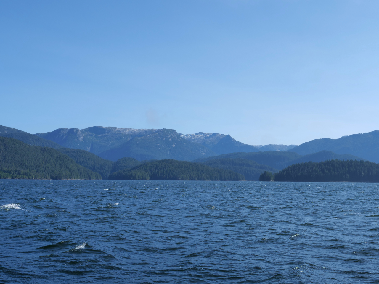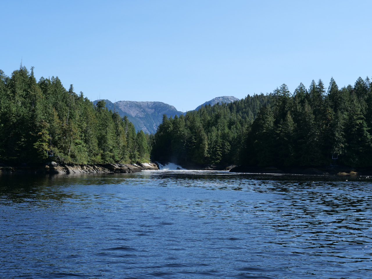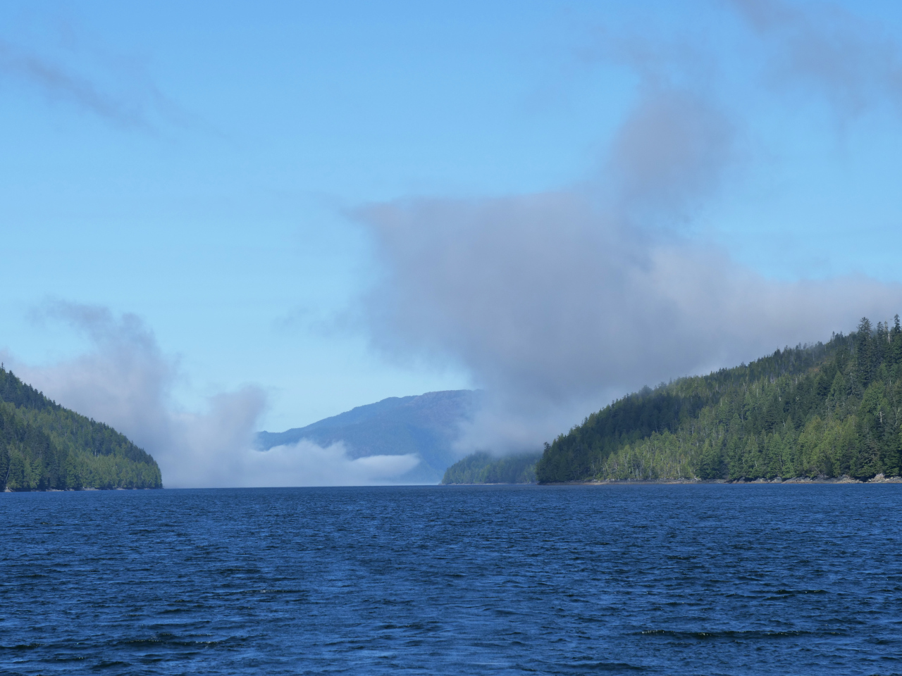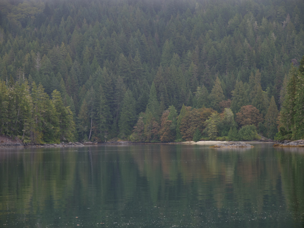 Die erste Nacht in Kandada verbringen wir mit einem Motorboot und einem Fischerboot im Lawson Harbor/Kelp Passage. Täglich geht es weiter durch den Grenville Channel bis dieser sich mit dem Douglas Channel und dem Whale Channel kreuzt und wir einen nächsten geschützten friedlichen Ankerplatz hinter einer kleinen Insel finden. Den Princess Royal Channel passieren wir als nächstes. Beidseits dicht bewaldet, mit vielen Wasserfällen gespickt setzen wir unsere Reise fort. Oft liegt dichter Morgennebel. Es wird langsam Herbst und die Tage werden kürzer. Dort wo Laubbäume zu finden sind erscheinen die ersten wunderschönen Herbstfarben. Hat sich der Nebel/Dunst aufgelöst ist Wetter schön. Vorbei rauschen wir (manchmal) an 1001 Inselchen und Felsen in verschiedensten Formationen, oft spriessen aus den Felsen ein paar (vorwitzige) Tannen. Fitz Hugh Sound folgt als nächster bevor wir eine kurze Strecke gegen den offen Pazifik queren. Gerade dort erwischt uns ein Tief mit Starkwind. Unsere ausgewählte Ankerbucht bietet jedoch hinter den verwinkelten Inseln wunderbaren Schutz und wir liegen ruhiger als in mancher Marina.