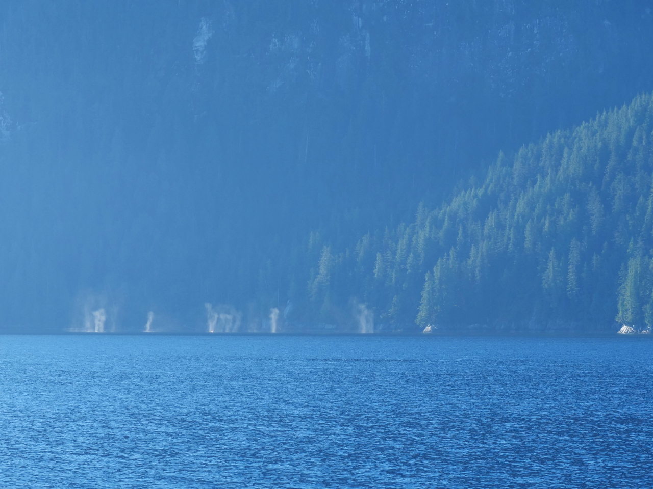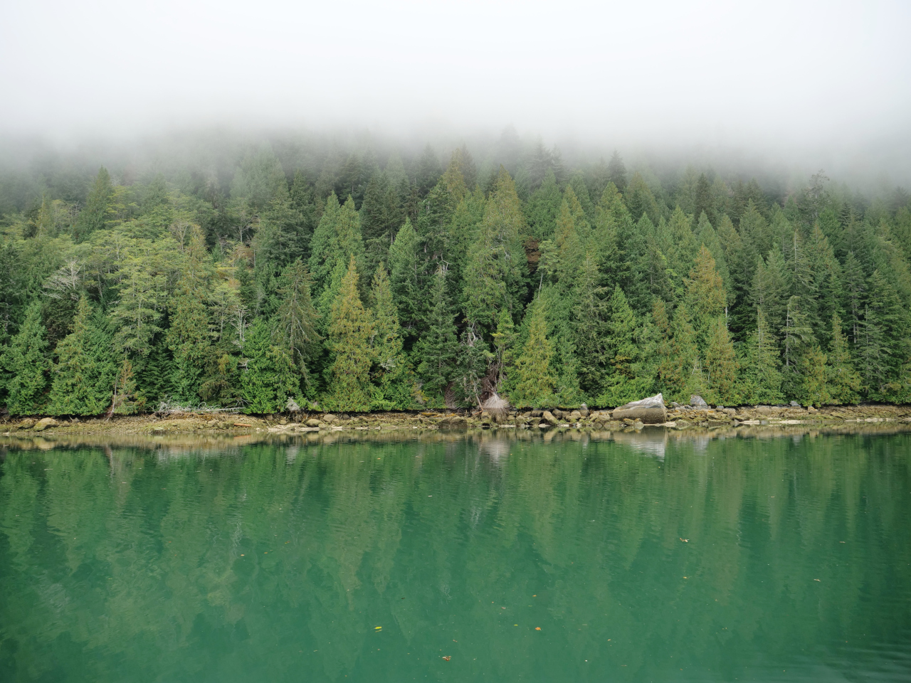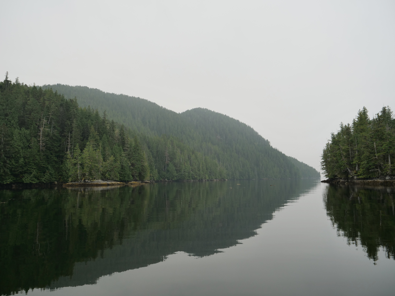 Die erste Nacht in Kandada verbringen wir mit einem Motorboot und einem Fischerboot im Lawson Harbor/Kelp Passage. Täglich geht es weiter durch den Grenville Channel bis dieser sich mit dem Douglas Channel und dem Whale Channel kreuzt und wir einen nächsten geschützten friedlichen Ankerplatz hinter einer kleinen Insel finden. Den Princess Royal Channel passieren wir als nächstes. Beidseits dicht bewaldet, mit vielen Wasserfällen gespickt setzen wir unsere Reise fort. Oft liegt dichter Morgennebel. Es wird langsam Herbst und die Tage werden kürzer. Dort wo Laubbäume zu finden sind erscheinen die ersten wunderschönen Herbstfarben. Hat sich der Nebel/Dunst aufgelöst ist Wetter schön. Vorbei rauschen wir (manchmal) an 1001 Inselchen und Felsen in verschiedensten Formationen, oft spriessen aus den Felsen ein paar (vorwitzige) Tannen. Fitz Hugh Sound folgt als nächster bevor wir eine kurze Strecke gegen den offen Pazifik queren. Gerade dort erwischt uns ein Tief mit Starkwind. Unsere ausgewählte Ankerbucht bietet jedoch hinter den verwinkelten Inseln wunderbaren Schutz und wir liegen ruhiger als in mancher Marina.