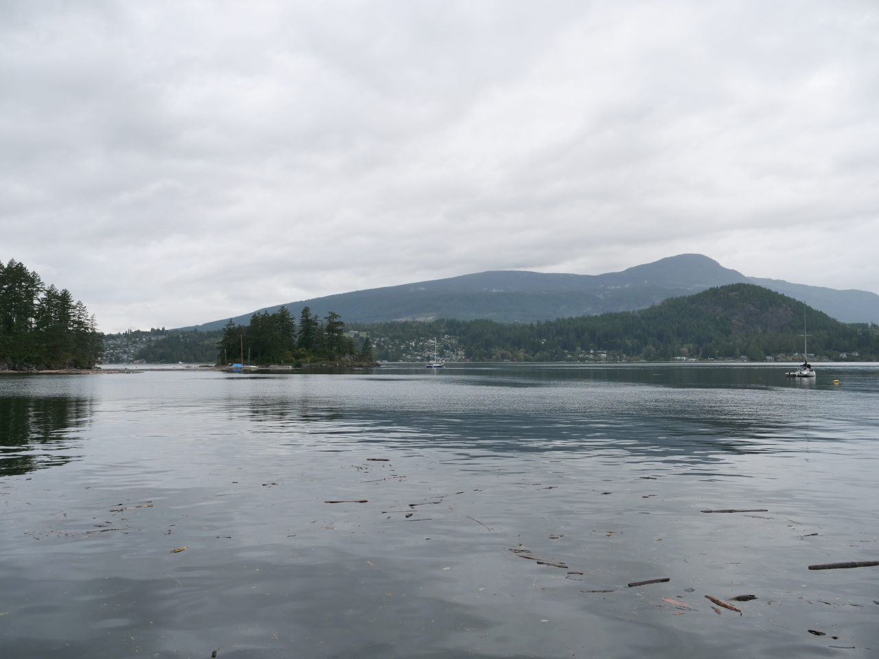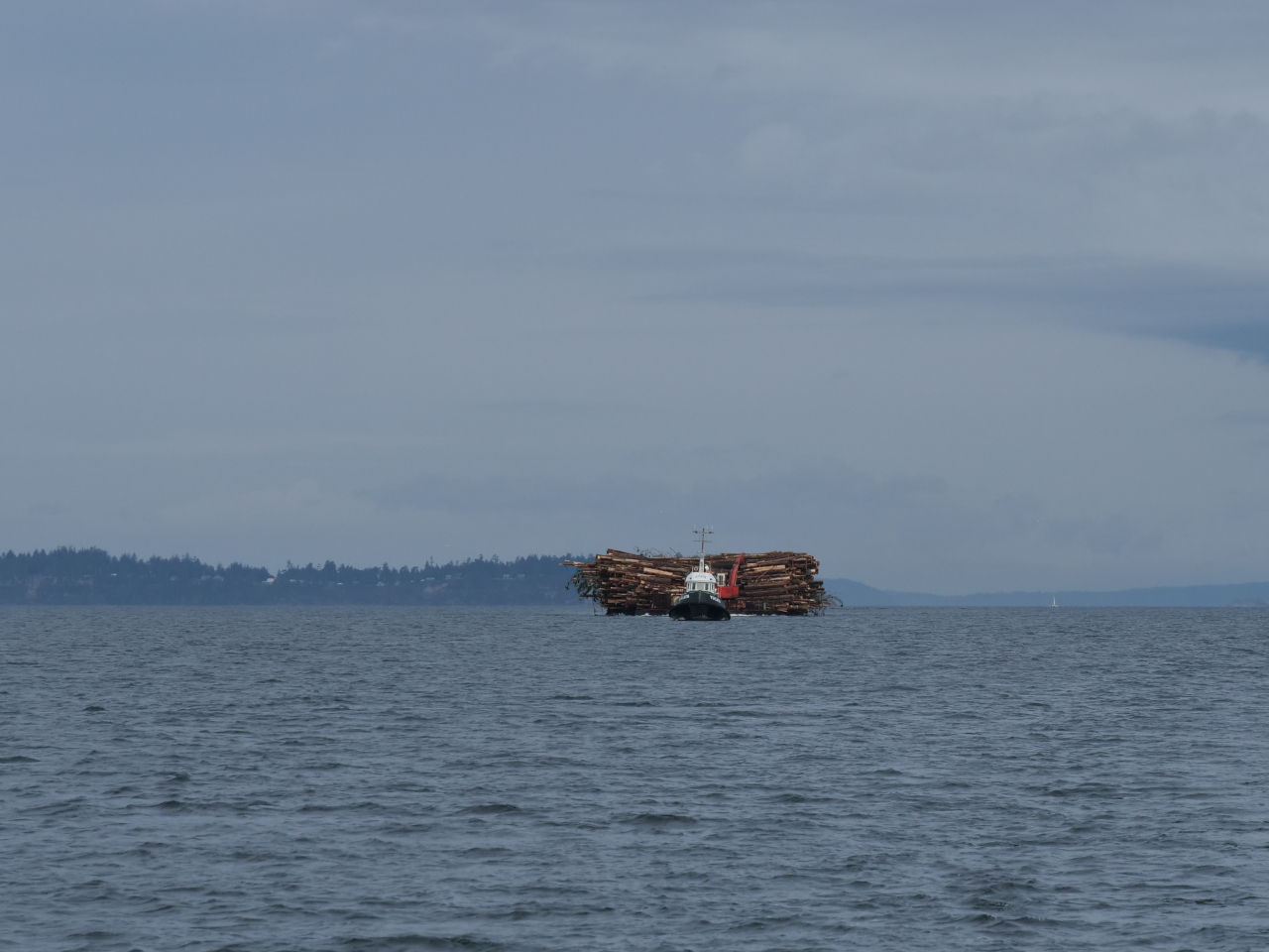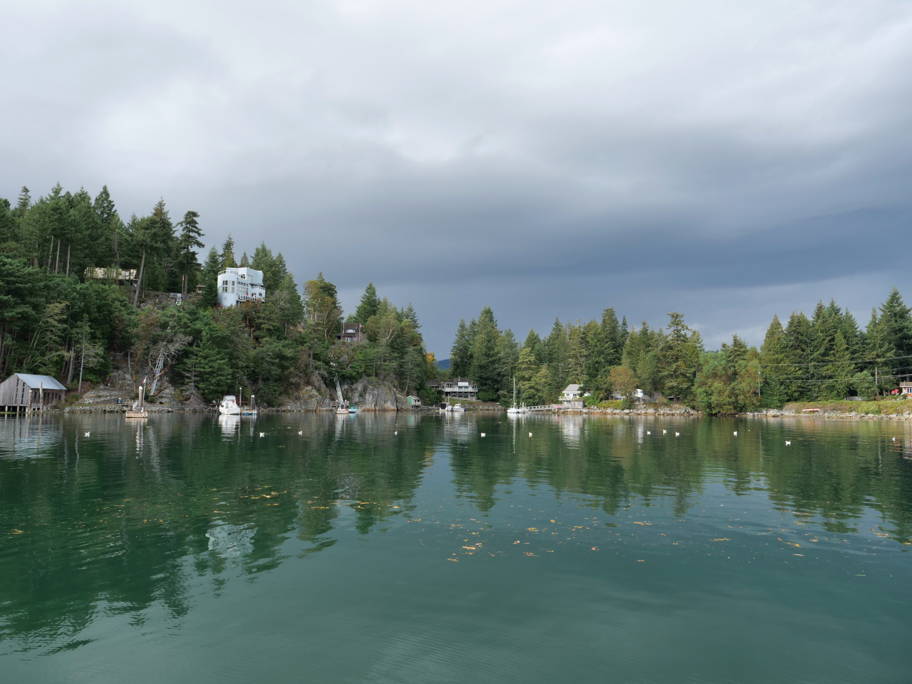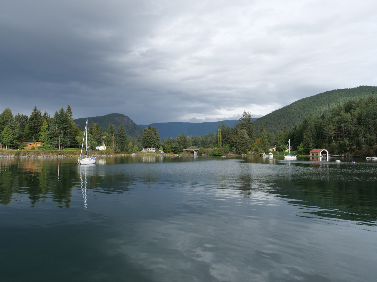 Die Seymour Narrows, so steht es in den Segelführern, ist eine zwei Seemeilen lange enge Stelle, welche bis zu 16 kn Flutstrom und bis zu 14 kn Ebbstrom führen kann. Der ganze Schiffverkehr führt hindurch. Oft sind Schlepper unterwegs, ein gängiges Transportmittel in Kanada und USA. Alles in allem heisst das für uns gut berechnen und sehr achtsam sein und hoffen, dass die Sicht einigermassen gut ist. Wir gelangen rascher als berechnet zu den Seymour Narrows. So nehmen wir diese heikle Passage gegen Abend in Angriff. Es brodelt ganz schön und mit einem Maximum von 8 kn Strömung plus unsere Schiffsgeschwindigkeit unter Motor bewältigen wir die Passage. Kurz darauf schlüpfen wir an unseren ruhigen Ankerplatz. Das schöne Spätsommerwetter ändert sich und löst eine Periode von kurzen Regenschauern, bedecktem Himmel, Nebel und ab und zu einem Stück blauen Himmels ab. Wir sind in der Zivilisation angekommen. Kleine und grössere Häfen und Dörfer reihen sich aneinander. Vermehrt sind Fischzuchten zu sehen. Grosszügige Ferienhäuser mit privatem Bootssteg ragen an wunderschönen Plätzen hervor. Auch Handy-Netz (und damit Internet) ist fast überall vorhanden, was für uns angenehm ist. In der Cortes Bay haben der YC Seattle und der YC Vancouver eine Zweigstelle. Wir ankern an diesem lauschigen Plätzchen und verbringen eine Nacht.