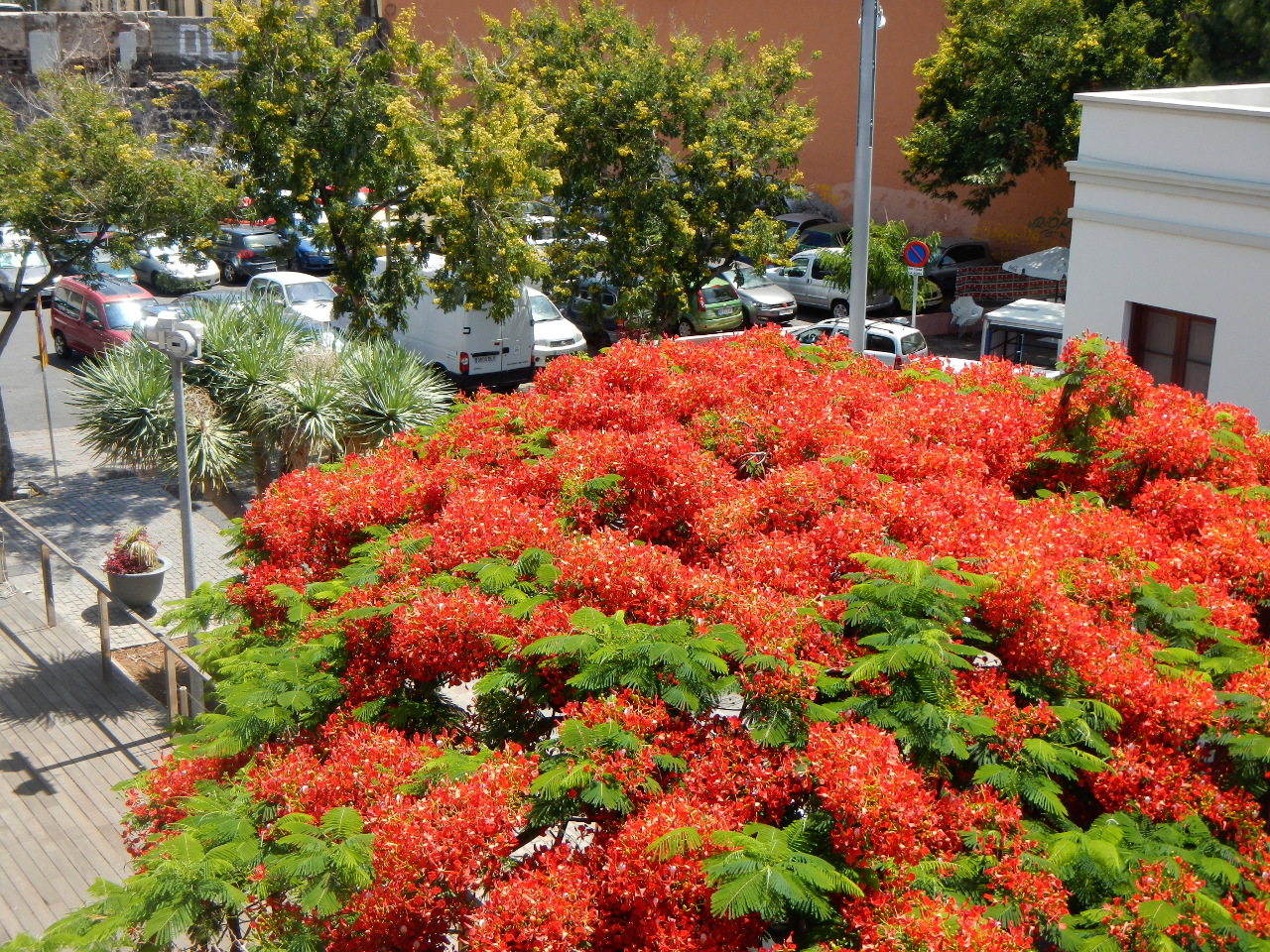 Wir kehren Ende Juni aus unserem „Landurlaub“ in Deutschland und der Schweiz nach Santa Cruz de Tenerife zurück. Die Dada Tux erwartet uns etwas schmutzig, jedoch unversehrt in der Marina. Seit fünf Jahren gehört sie zu uns, seit einem Jahr ist sie unser Zuhause und es ist auch für mich so eine Art wie „heimkommen“, etwas das ich mir vor kurzem gar nicht vorstellen konnte. Die Temperaturen sind sommerlich warm (gut 30°). Die Flammenbäume (flamboyants) stehen in voller Blüte und tragen zu recht diesen Namen.